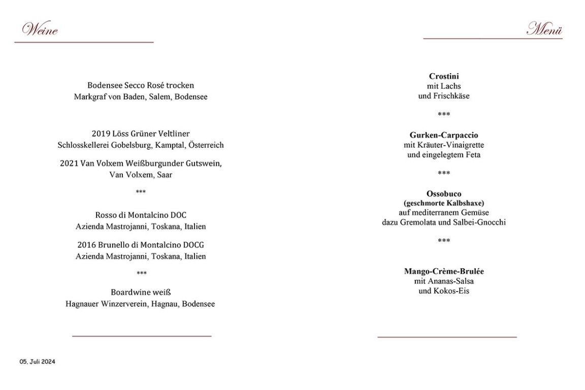 Das Menü stand recht schnell fest und die Weine waren schnell im Keller gefunden. Ich wollte schon lange mal Brunello mit seinem kleinen Bruder Rosso di Montalcino vergleichen, Rosé-Secco ist der Inbegriff von Sommer, leicht fruchtig unbeschwert. Noch zwei unkomplizierte leichte frische Weißweine und ein Dessertwein und schon ist das WeinMenü komplett.