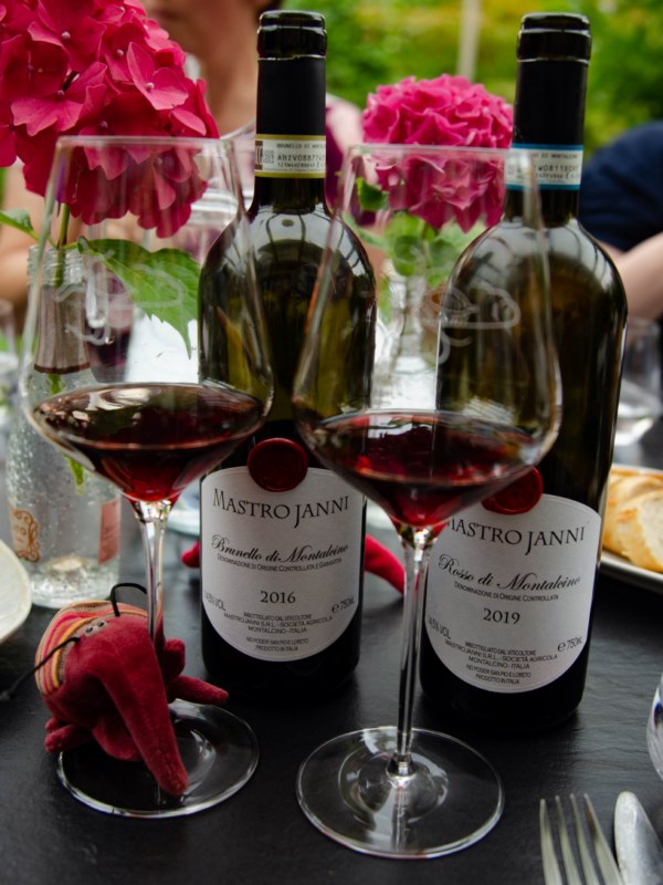Der Brunello di Montalcino (55 €) im Vergleich zum Rosso di Montalcino (19 €) von Azienda Mastrojanni. Beide Weine sind Weine der Toskana aus dem Anbaugebiet um das Städtchen Montalcino, im Südosten der Toskana gelegen. Brunello ist die Rebsorte, eine Unterart des bekannten Sangiovese, welcher die Hauptrolle in der Toskana (Chianti ist auch eine Region in der Toskana) spielt. Der Brunello wird aus dem besten Traubengut vinifiziert, lagert zwei Jahre im Barrique und drei Jahre auf der Flasche, bis er in den Handel kommt. Der Rosso di Montalcino ist hochkarätig, aber bezahlbar und aus dem Traubengut, das den hohen Ansprüchen des Brunello nicht genügt. 12- 15 Monate im Barrique und einige Monate auf der Flasche, dann darf er in den Handel.