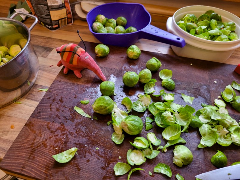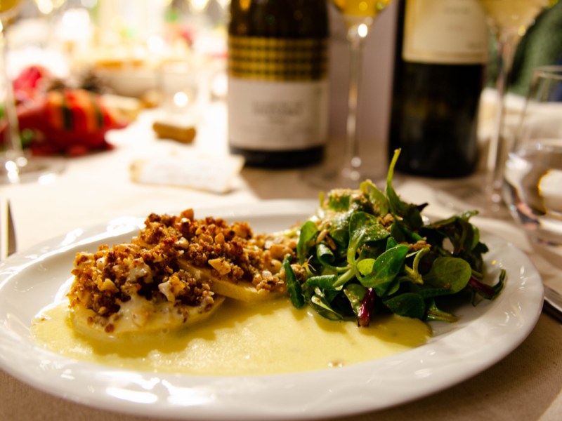 Zur Vorspeise zwei kräftige Weißweine. 2019 Collecció Privada Tempranillo Blanco Crianza, Bodegas Marqués de Reinosa, Rioja, Spanien (17,90 €, geile-weine.de) und 2020 Château Laurence - Bordeaux blanc (17,50 €, extraprima-weinversand). Tempranillo weiß ausgebaut, wollte ich unbedingt probieren. Leider war sehr viel amerikanisches Holz im Spiel. Solo sehr weich, viel Vanille, wenig Frucht. Es fehlte ihm etwas an Rückrat. Dagegen war der Sauvignon Blanc ein Traum von einem Weißwein und sein Geld absolut wert. Auch hier ertwas Barrique, wobei europäische Eiche. Ausbalanciert, viel Spannung, toller Körper, kein bisschen verspielt, wie man Sauvignon manchmal kennt, einfach ernst zu nehmen und perfekt zum Essen. Er hat es super mit der kräftigen Käsesoße und dem Roggencrumble aufnehmen können, war aber auch neben dem süßlichen Dressing einfach fein. Der Tempranillo hat mit dem Essen verloren.