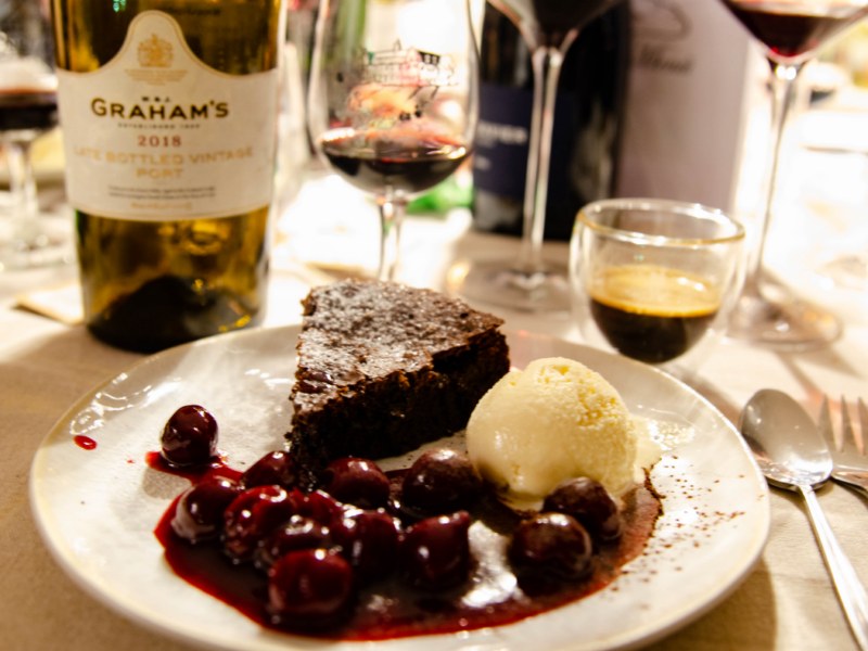 Zum heißgelieben Schokoladenkuchen mit Kirschen und Marzipaneis gab es wieder den 2018 Graham's Late Bottled Vintage Port (20 € amazon). Ein Ruby Port, also nicht oxidativ gereift, sondern die intensive rote Frucht erhalten. Schokolade, Kirsche und Portwein kann nur noch mit Marzipaneis getopt werden :-), eins meiner Lieblingsdesserts.