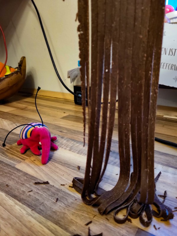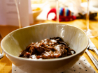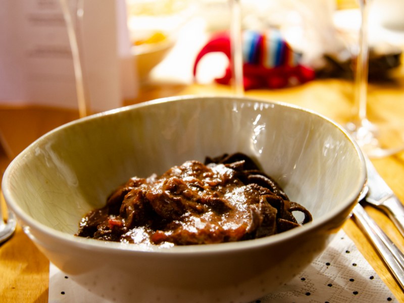 Dann kam der Hauptgang, Geschmortes Rindfleisch mit selbstgemachten Schokoladen-Nudeln. Da der Tempranillo schon so gut wie leer war habe ich die Flasche Andrés Alonsa Garnacha Syrah (weinfreunde 7,95 €), welcher zu einem drittel schon zum Kochen herhalten musste (fürs Essen, nicht für die Köchin), ausgeschenkt. War auch sehr gut. Ja und dann fiel mir mein Fehler auf und ich habe die Flasche Secco Schoko-Rosso im Kühlschrank entdeckt. Dieser Secco ist der Hammer. Mit Schokoladenaromen versetzt, fruchtig intensiv (Erdbeermarmelade oder die Erdbeeren die man von früher aus der Bowle kennt, Sauerkirsche, auf jeden Fall rote süße Frucht). Zum so trinken, ja sogar zum Gulasch, aber auch zum Kuchen passend. Geiles Zeug.
