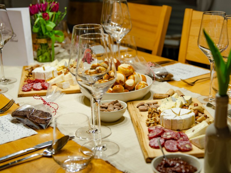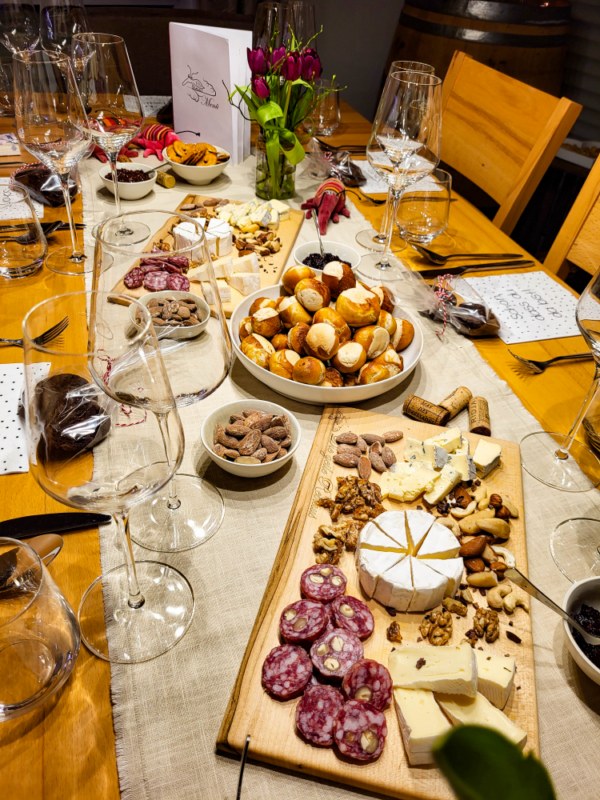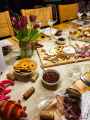Jetzt waren alle frei sich durch die Käseplatte zu probieren. Mit Laugenbrötchen und Zwiebel-Zwetschgen-Marmelade und vielen anderen Leckerein.