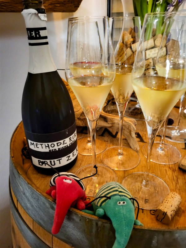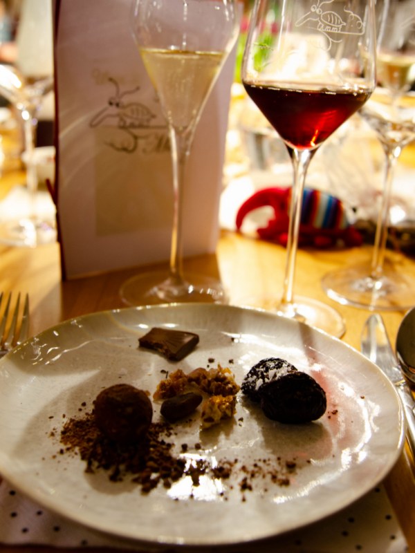 Gleich daneben gab es den Bodensee Semi Secco Rot von Markgraf von Baden, Bodensee (Hack, Haus der Guten Weine, Meersburg 7,50 €). Intensive Aromen von roten Beeren. Dazu mit dunkler Schokolade gefüllte Dörrpflaumen, mit einem Hauch Voatsiperifery Pfeffer und Pyramiden-Salz. Die Süße Frucht der Pflaume kam noch mehr zur Geltung und auch die dunkle Schokolade kam mit dem Secco richtig gut rüber.