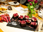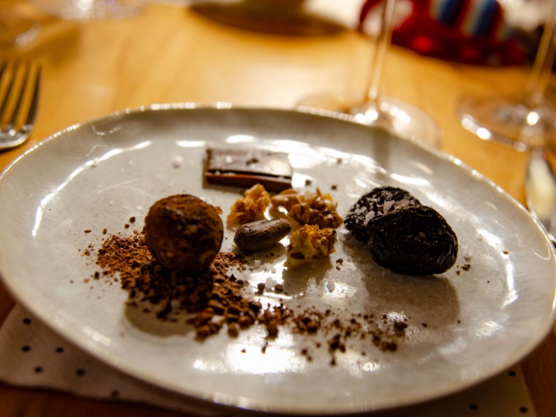 Als nächstes Erlebnis lag eine Roquefort Praline und eine geröstete Kakaobohne auf dem Teller. Blauschimmelkäse hat eine besondere Schärfe und Roquefort ist die Königin der Blauschimmelkäse. Um diese Schärfe zu mildern hilft es eine Kaffebohne oder wie in unserem Fall eine Kakaobohne dazu zu essen. Pure Kakobohne ist einfach bitter, kein bisschen süß. Zusammen ist beides bekömmlicher. Aber aus meiner Sicht noch immer etwas für Fortgeschrittene. Auf jeden Fall ein Versuch wert und der süße Secco rot hat auch hier wieder gut gepasst.