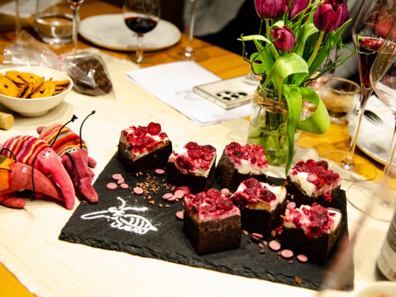 Nachdem wir alle satt waren kam nun das Dessert. Brownie mit Frischkäse und Himbeeren und dazu rote Schokolade. Nicht gefärbt sondern aus roten Kakaobohnen gemacht. Dazu heißt es soll ein fruchtiger Rosé passen. Gesagt getan. Aufricht Seegucker (12,70 €). Und ja, die Aromen von Himbeere und Erdbeere welche man vom Spätburgunder Rosé kennt haben sich mit den Aromen der roten Schokolade verbunden. Und erstaunlich war, das die Schokolade nicht zu süß war mit dem Wein, obwohl solo gegessen die rote Schokolade schon ganz schön süß ist. Fruchtaromen sei Dank.
