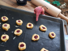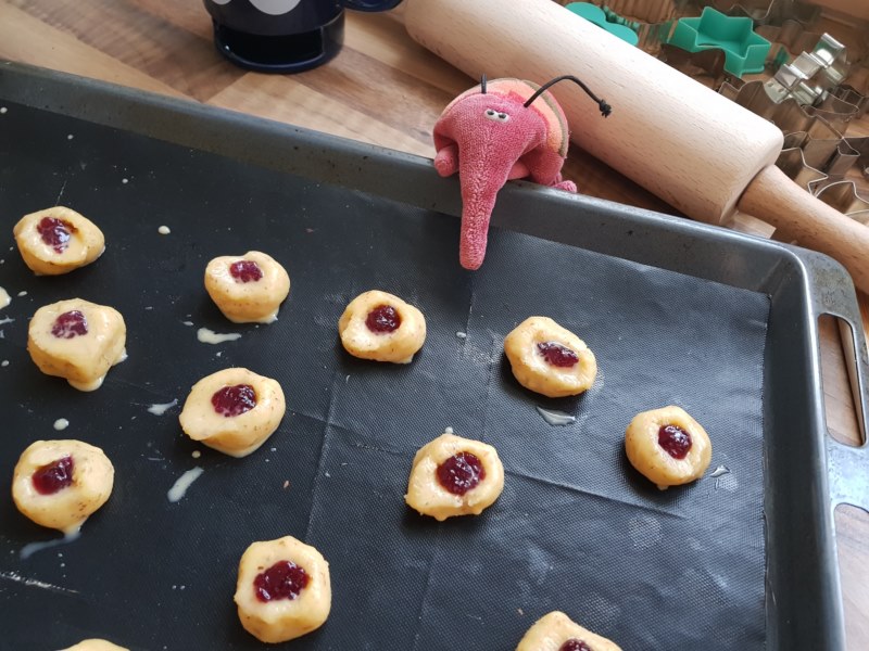 Teig in vier Stücke teilen und auf wenig Mehl zu 15 cm langen Rollen formen. Rollen jeweils in 10 Stücke teilen, diese zu Kugeln formen und auf Backblech setzen. Mit Kochlöffelstiel eine Mulde in die Kugeln drücken. 1 Eigelb mit 1 TL Milch verrühren und Kugeln damit bestreichen. Mulde mit Himbeerkonfitüre füllen. Nochmal eine halbe Stunde kalt stellen.