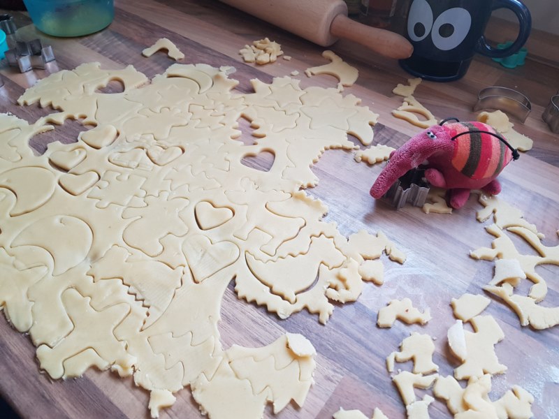 Teig ausrollen und Plätzchen ausstechen. Bei 180°C auf Backpapier ca. 10 Minuten (bis Ränder golden sind) backen und dekorieren.