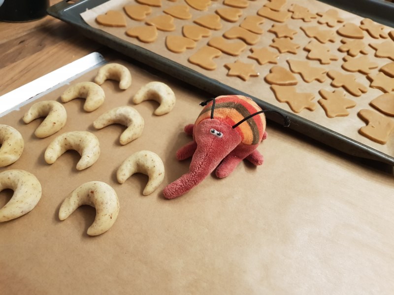 150 g Butter, 75 g Puderzucker, 1 EL Vanillezucker cremig rühren. 2 Eigelbe nach und nach unterrühren. 175 g Mehl mit 50 g gemahlenen Mandeln mischen, zur Eiercreme geben und rasch zu einen glatten Teig verarbeiten. Mind. 2 Stunden in Kühlschrank.