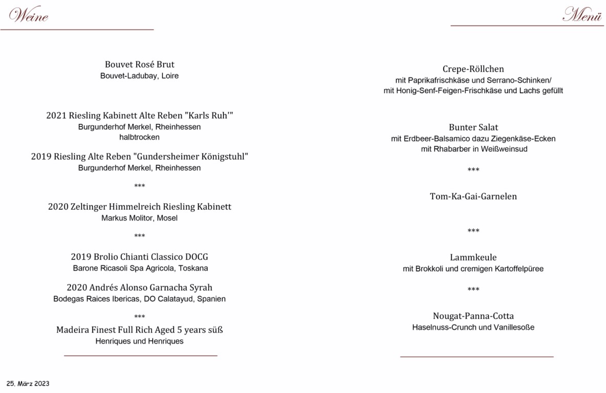 Was für ein toller Abend! Es war mein erstes WeinMenü außer Haus und ich hätte mir keine besseren Gäste wünschen können. Von Anfang bis Ende gute Stimmung, ganz viele Fragen, welche ich gerne beantwortet habe und auch Geschichten von Weinerlebnissen und -reisen, welchen ich lauschen durfte :-) Das Essen und der Wein waren wie immer ein Genuss.