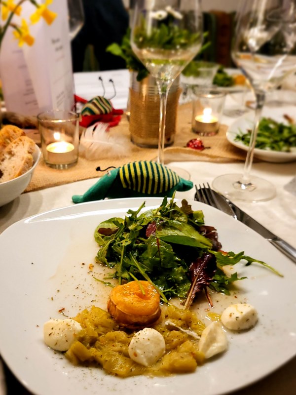 Der 2021er Riesling Kabinett Alte Reben "Karls Ruh'" halbtrocken war frisch süffig, mit seiner frischen Fruchsäure wirkte er sogar eher trocken als halbtrocken. Ein Wein der allen auf Anhieb geschmeckt hat und auch zu den Mozzarella-Kügelchen perfekt gepasst hat.