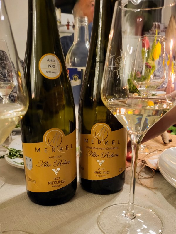 Der 2019er Riesling Alte Reben "Gundersheimer Königstuhl" hatte eine präsentere Säure und weiste Reifenoten auf, kräftiger im Geschmack und beim ersten Schluck etwas anstrengender als der Kabinett "Karls Ruh". Von der Kombination mit Ziegenkäse haben Wein und Ziegenkäse profitiert. Beides gewann an Frische und durch den kräftigen Geschmack von beidem wurden Mozzarella und Kabinett schnell in den Hintergrund gedrängt. Auf alle Fälle hat sich gezeigt, dass mancher Wein erst mit der richtigen Speise zur Geltung kommt, aber auch das so manche Speise mit dem Wein gewinnt.