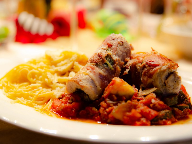 Unser Hauptgang, Saltimbocca alla Milanese mit mediterranem Ofen-Gemüse und selbstgemachten Nudeln war einfach Bella Italia. Durch den Salbei (das nächste Mal nehme ich weniger) war das Kalbsschnitzel sehr kräftig gewürzt und verlangte so nach einem kräftigeren Wein als ursprünglich angenommen.
