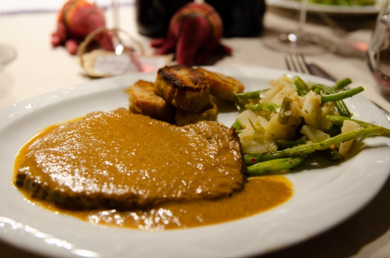 Die Vorspeise war super lecker. Und beide Weine, Weissburgunder & Chardonnay "Gundersheimer Höllenbrand" vom Burgunderhof Merkel und der 2019 Mâcon Chardonnay Echenault de Serre von Domaine des Crêts aus dem Burgund hätten beide passend sein können. Allerdings war der Weissburgunder & Chardonnay mit seinem Grapefruitaroma zu sommerlich frisch und der Mâcon Chardonnay mit seinen feinen Holzaromen zu kräftig. Ein klassischer Grauburgunder zum Beispiel von Kress hätte besser gepasst.